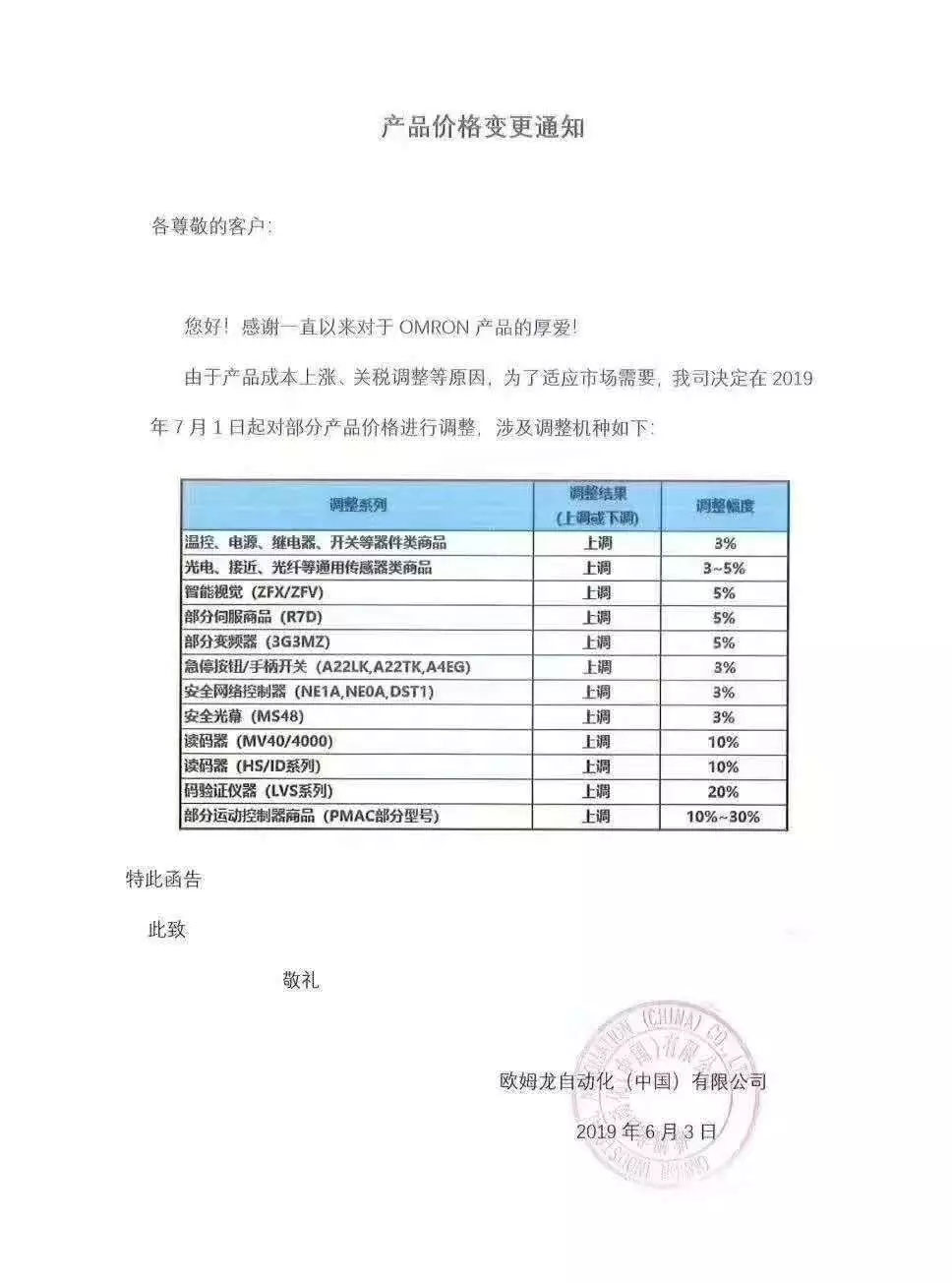 非常感謝新老客戶對歐姆龍產(chǎn)品和我公司的信任與支持,由于產(chǎn)品成本上漲、關(guān)稅調(diào)整等多方面的原因,歐姆龍的部分產(chǎn)品將于2019年7月1日起進(jìn)行價(jià)格調(diào)整,漲價(jià)幅度3%-30%不等。客戶朋友們可以根據(jù)自己的需要,提前準(zhǔn)備,盡快聯(lián)系我們下單。