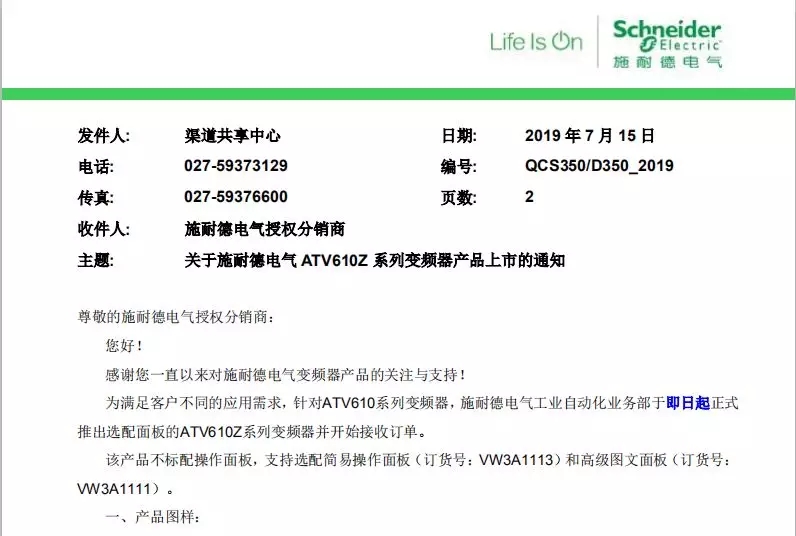 關于施耐德電氣變頻器相關產(chǎn)品上市通知