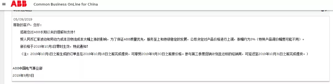 受人民幣匯率波動(dòng)和勞動(dòng)力成本及物流成本大幅上漲的影響,為了保證ABB質(zhì)量優(yōu)先,服務(wù)至上和持續(xù)穩(wěn)定的發(fā)展,公司決定對(duì)產(chǎn)品價(jià)格進(jìn)行上調(diào),漲幅約為3%(特殊產(chǎn)品調(diào)價(jià)幅度可能不同)。