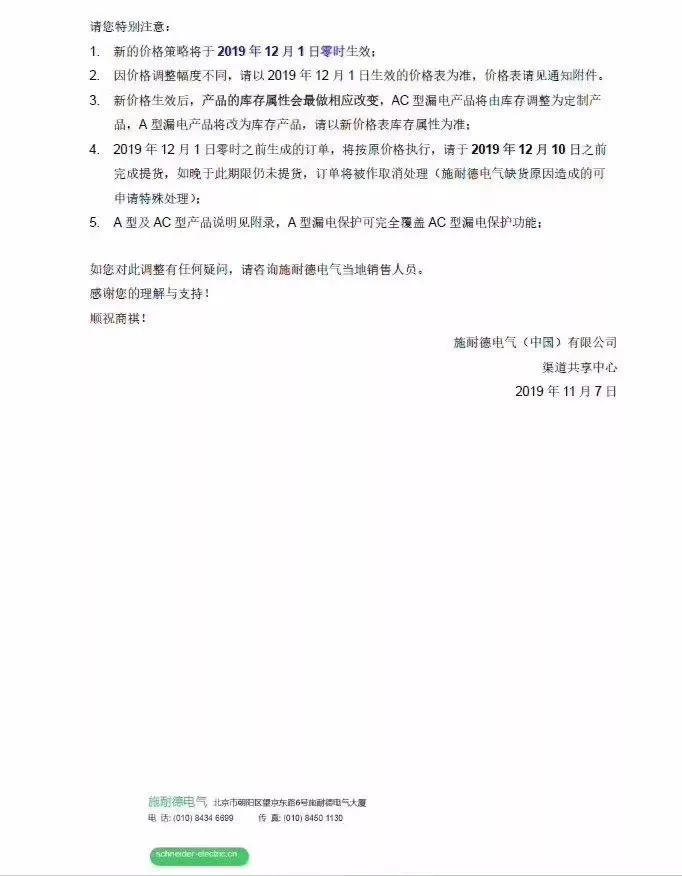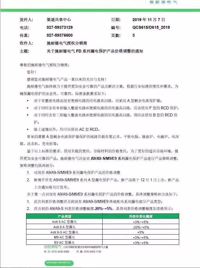 關(guān)于施耐德電氣FD系列漏電保護(hù)產(chǎn)品價格調(diào)整的通知